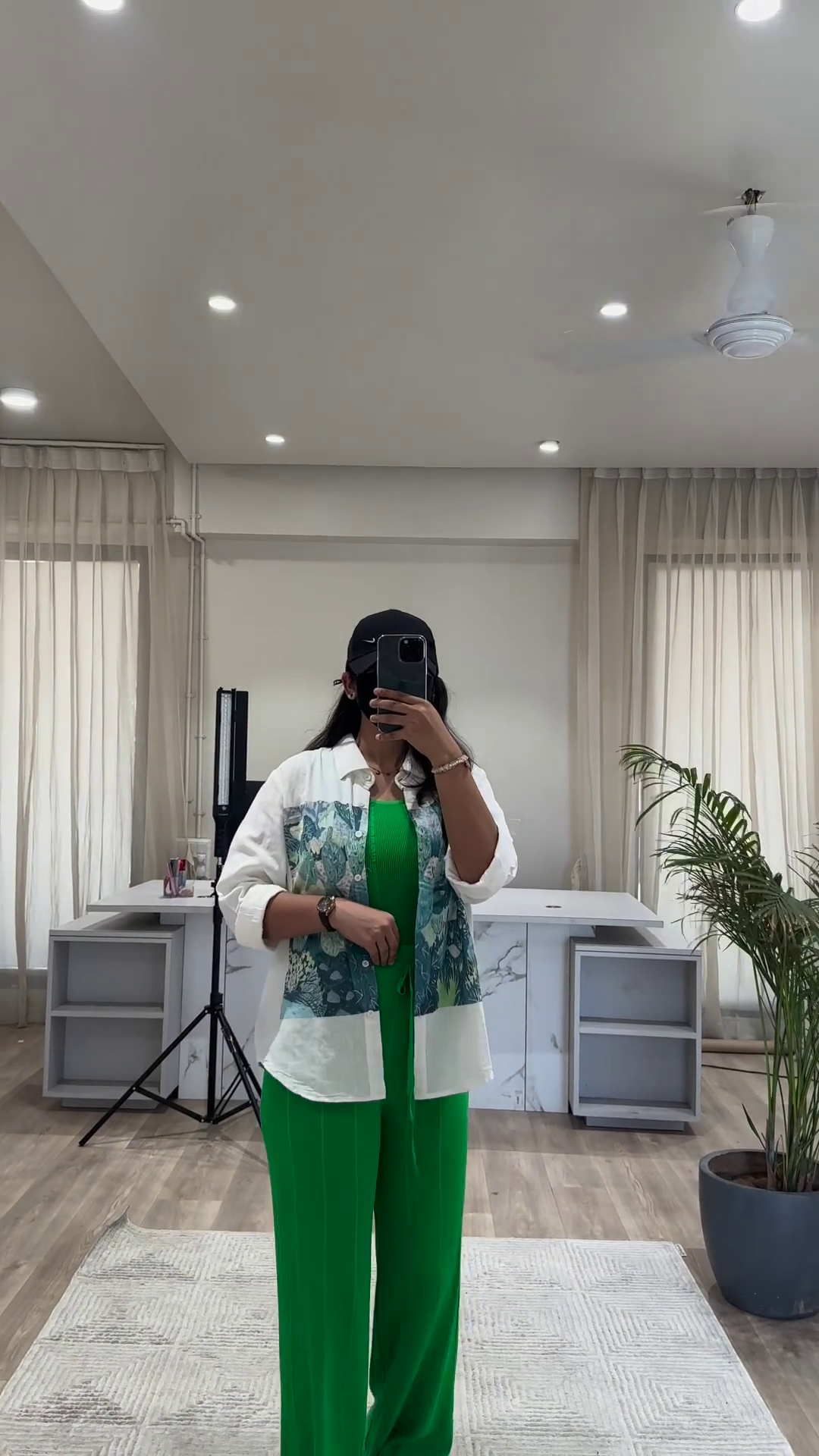 stylish and bohemian-inspired outfit. The ensemble features a patterned overshirt worn over a knit top, paired with wide-leg pants, and accessorized with a cap and boots. The setting appears to be a well-lit, modern interior space, possibly an office or a studio.