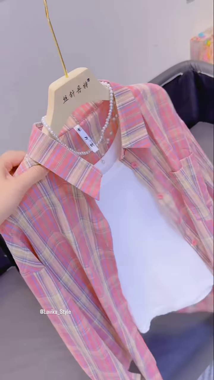 The inner top is a simple, solid white tank or camisole, which provides a clean and crisp base for the colorful plaid shirt. The contrast between the plain white and the patterned pink creates a balanced and visually pleasing aesthetic. The simplicity of the inner top allows the plaid shirt to be the main focus of the outfit while ensuring the overall look remains uncluttered and chic. This inner top is also a versatile staple that can be worn with other pieces in your wardrobe.