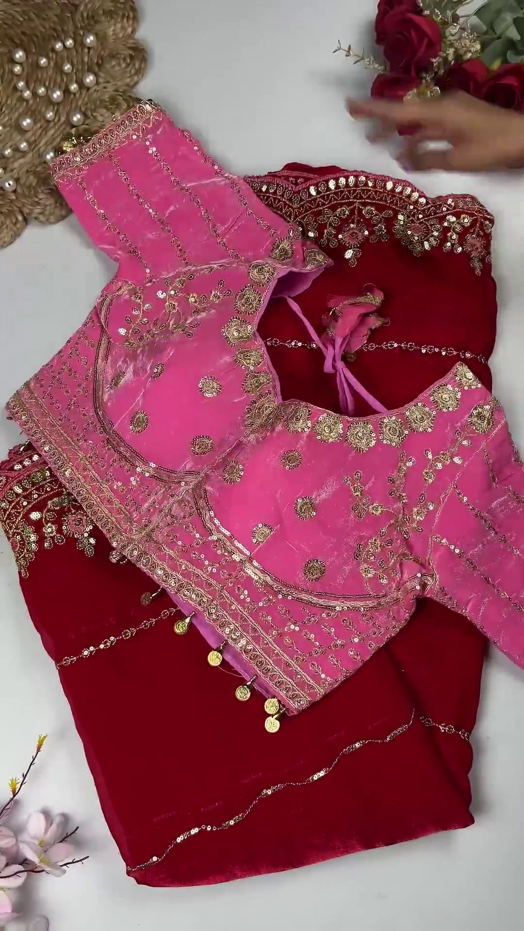 • Pair with an ivory or gold saree for a classic bridal look
