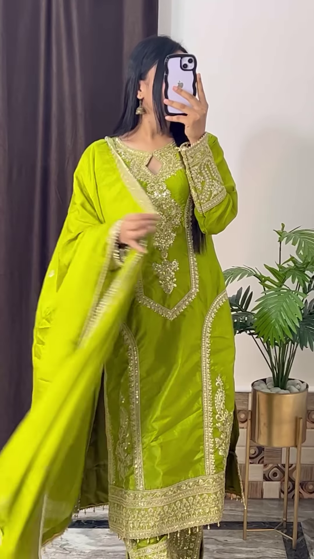 This deep magenta silk suit set is a perfect blend of modern color palettes and traditional embroidery. The kurta is crafted from a luxurious silk-blend fabric that offers a structured fit and a sophisticated natural sheen. The vibrant magenta color is modern and stylish, making it a great choice for women who want to add a fresh touch to their ethnic wardrobe. The fabric has a high density, ensuring it looks crisp and professional throughout the day.