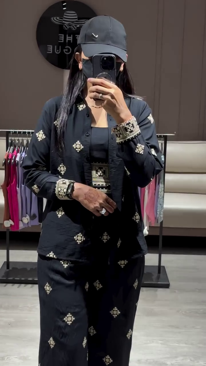 Adding a layer of elegance and versatility to the set is a long jacket, crafted from the same black fabric as the kurta and featuring coordinating embroidery along the cuffs and possibly the front or hem. The jacket can be worn open over the kurta for a layered and stylish look, adding a touch of formality and sophistication. It can also be paired with other tops and bottoms in your wardrobe, offering additional styling options suitable for the varied occasions in Ahmedabad. The length of the jacket typically falls below the hips, creating a graceful and elongated silhouette.