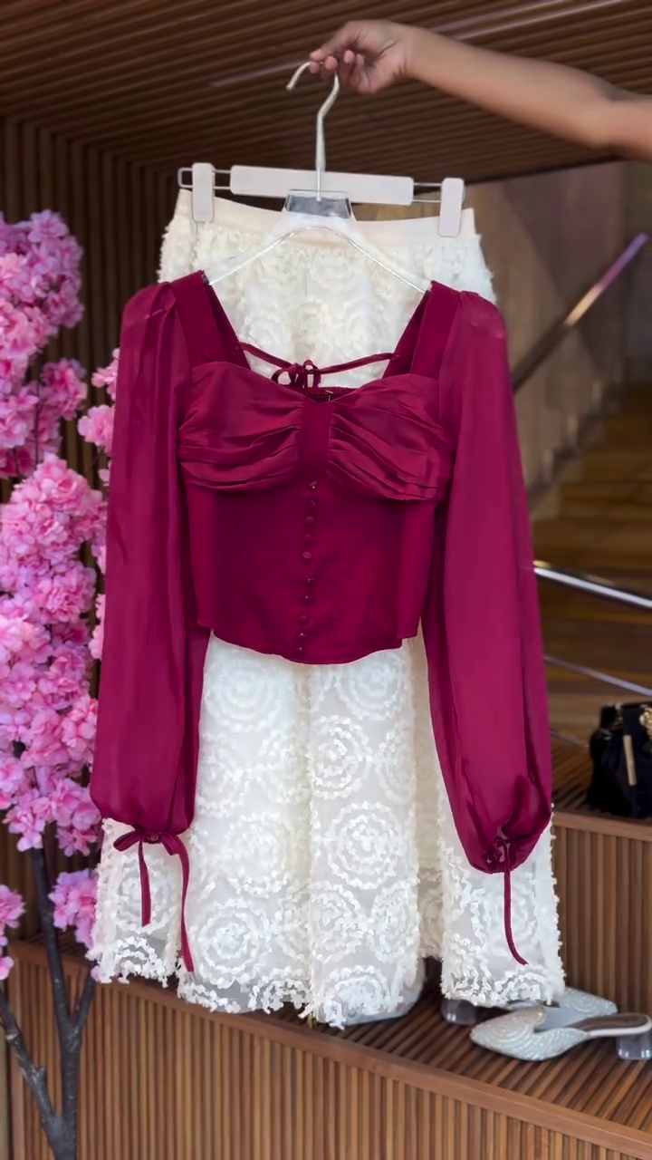 • Design: Floral embroidered cropped top + flared skirt combo