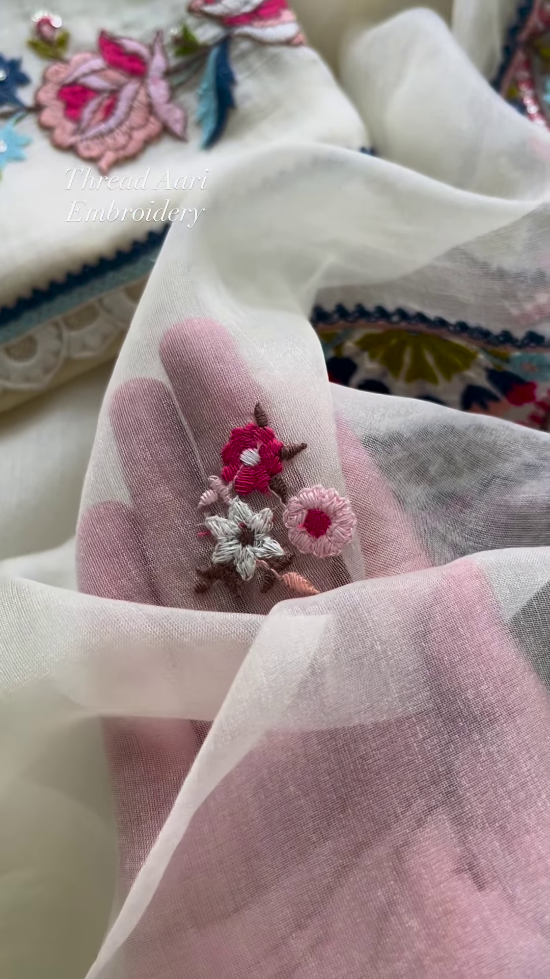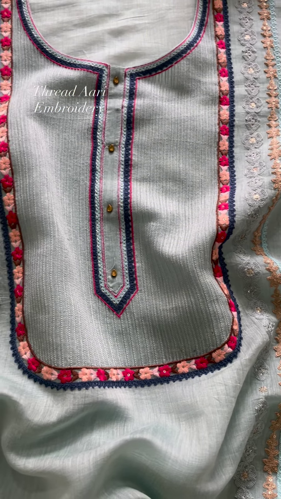 The main piece is a beautiful kurta, featuring a unique and eye-catching neckline. The fabric is a creamy, ethereal shade that offers a clean canvas for the elaborate Aari thread embroidery. This intricate form of needlework is visible around the neck and along the front placket, creating a striking border that frames the face beautifully. The embroidery is done in vibrant yet harmonious colors, including shades of deep blue, magenta, and a soft, rosy pink. The meticulous stitching forms a repeating floral and geometric pattern, adding a layer of texture and visual interest. The neck design is a modern take on a classic silhouette, with a keyhole detail and button embellishments that extend down the front, providing both a stylish and functional element. The main body of the kurta has a subtle, self-textured pattern, giving it a rich, tactile feel that complements the smooth, embroidered borders.