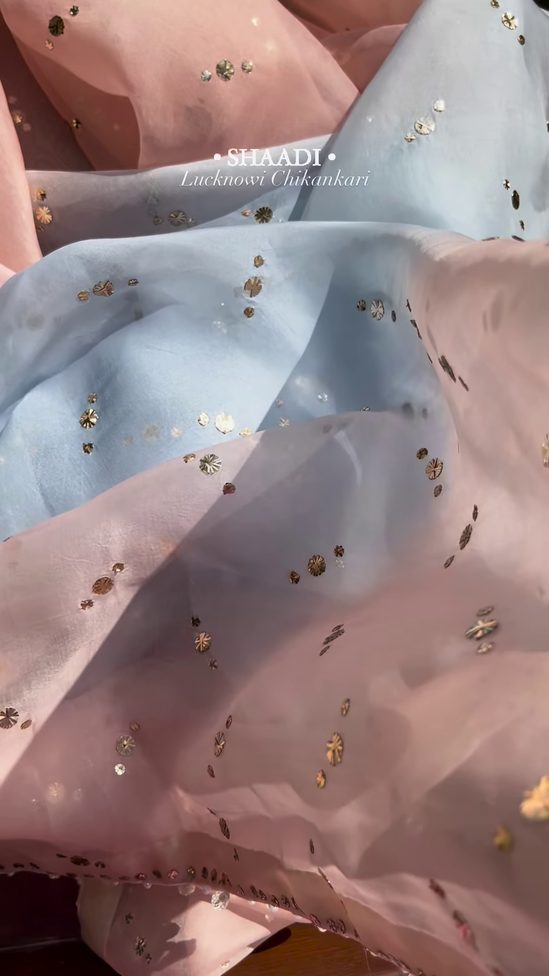 The kurta is a showcase of traditional Chikankari hand-embroidery. Intricate floral and vine patterns are meticulously hand-stitched across the entire front panel and sleeves using soft pastel threads in shades of lavender, blue, and sage green. To add a modern festive touch, the embroidery is interspersed with delicate “Mukaish” work and tiny transparent sequins. These elements reflect light subtly, providing a gentle shimmer that enhances the beauty of the hand-work without overpowering it. The sheer nature of the organza allows the intricate embroidery to appear as if it is floating, creating a magical and dreamy aesthetic.
