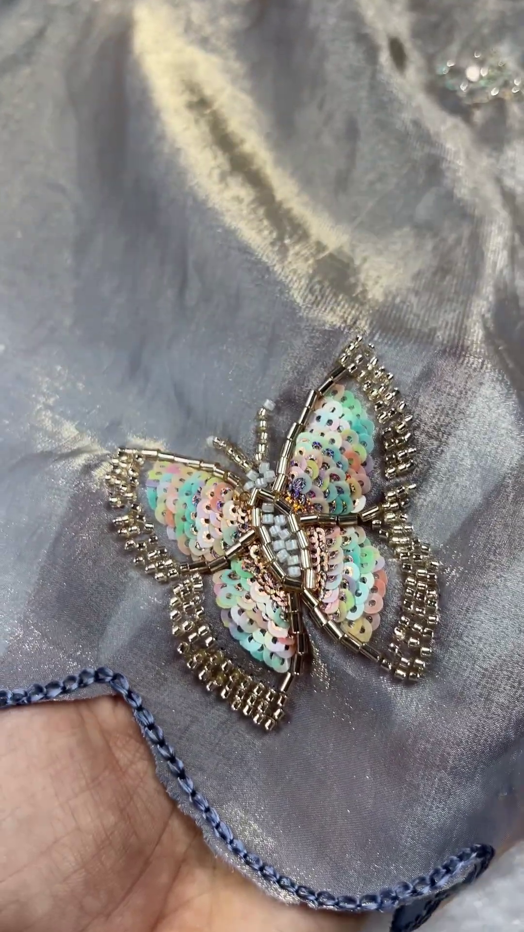 Intricate Zari & Sequin Work: The artisanal embroidery is highlighted with golden zari thread and shimmering sequins that catch the light beautifully.