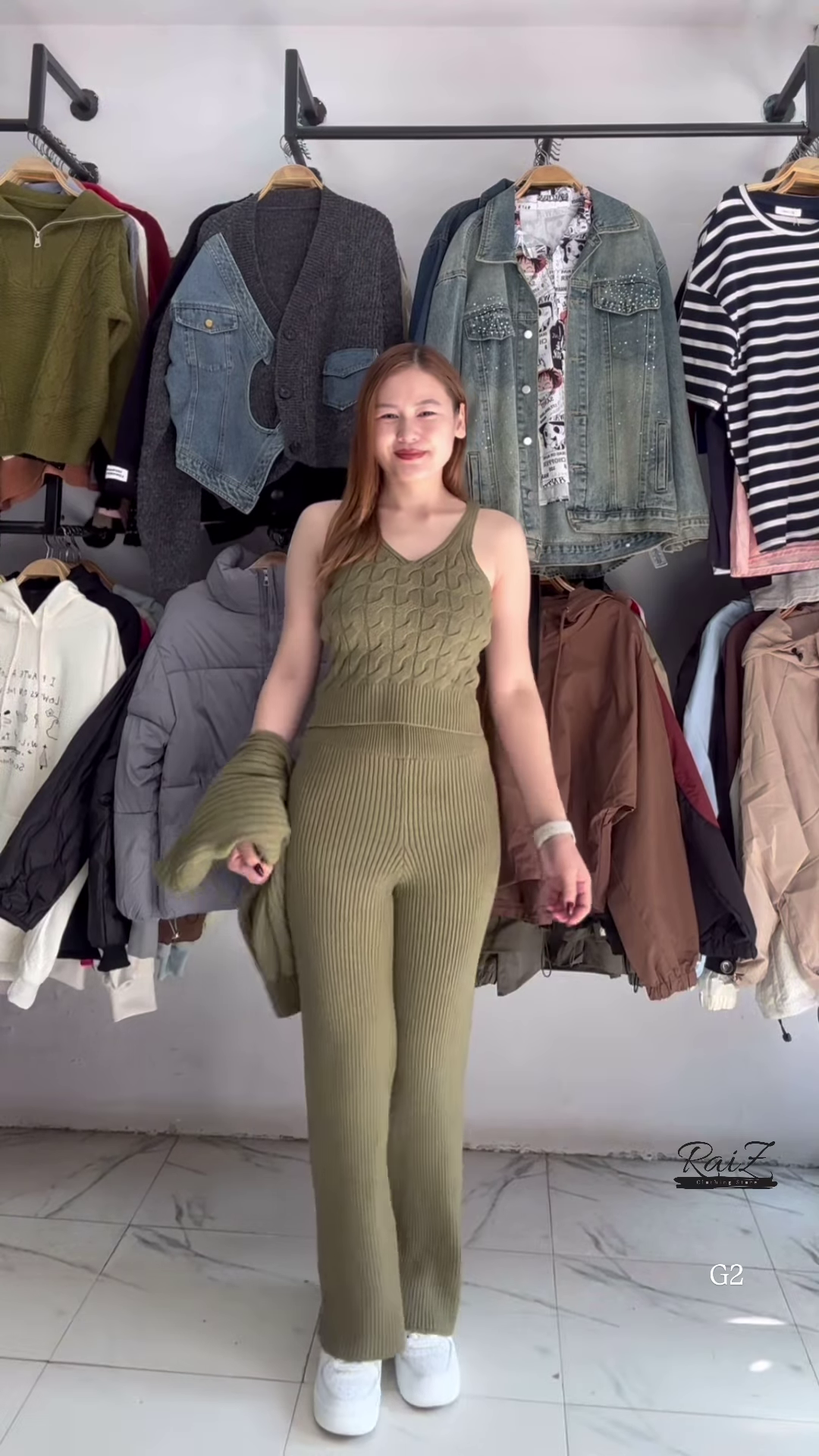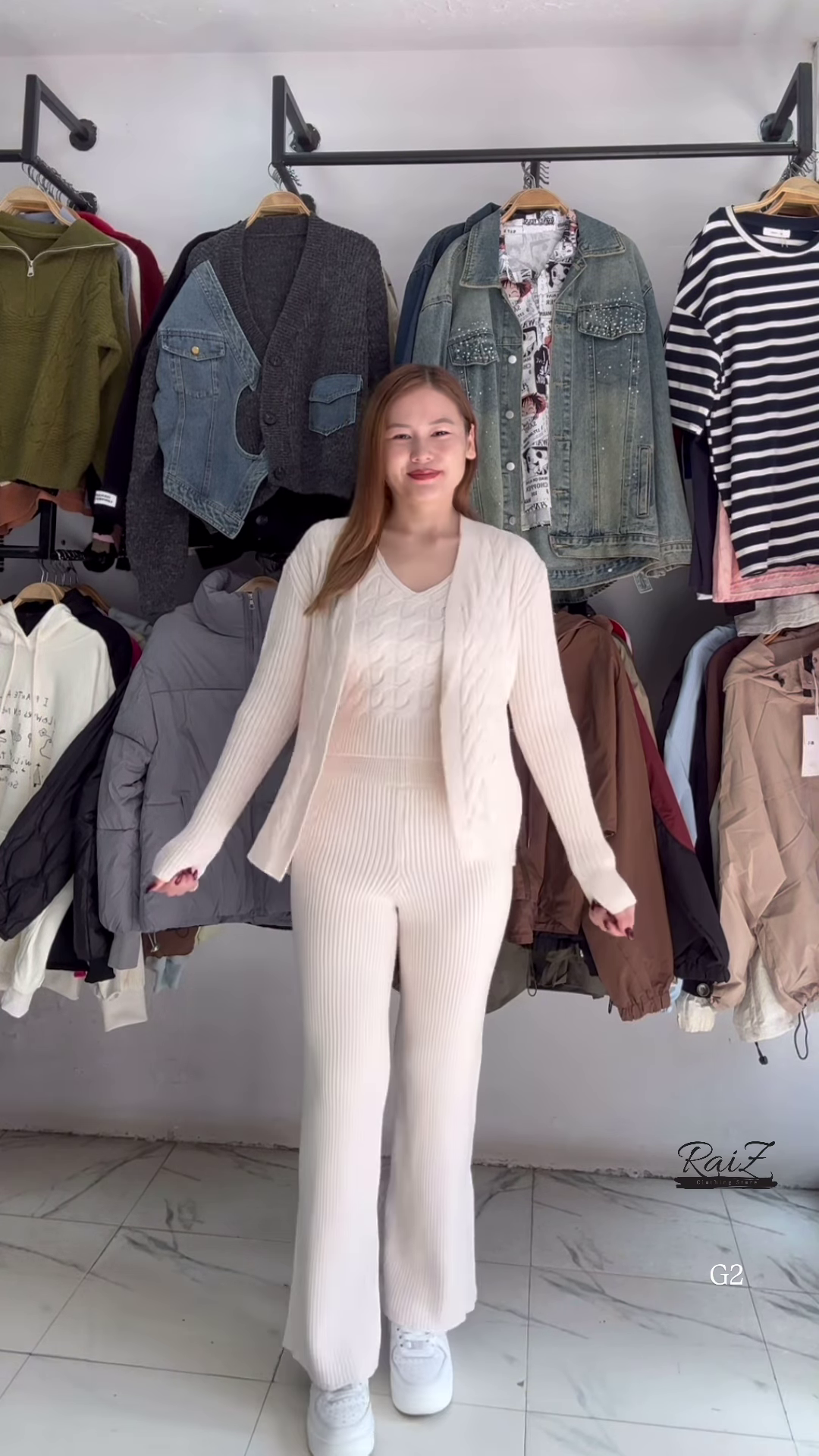 - 🌫 Grey: Coordinated cardigan, V-neck sweater, and flared pants in soft grey knit