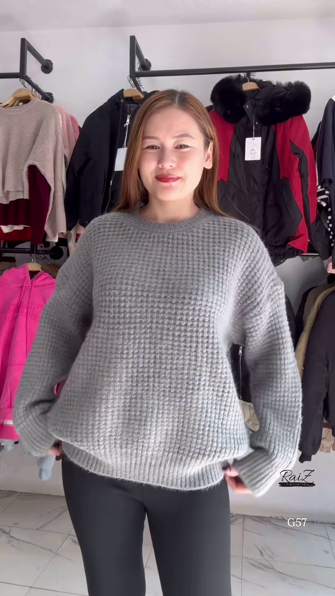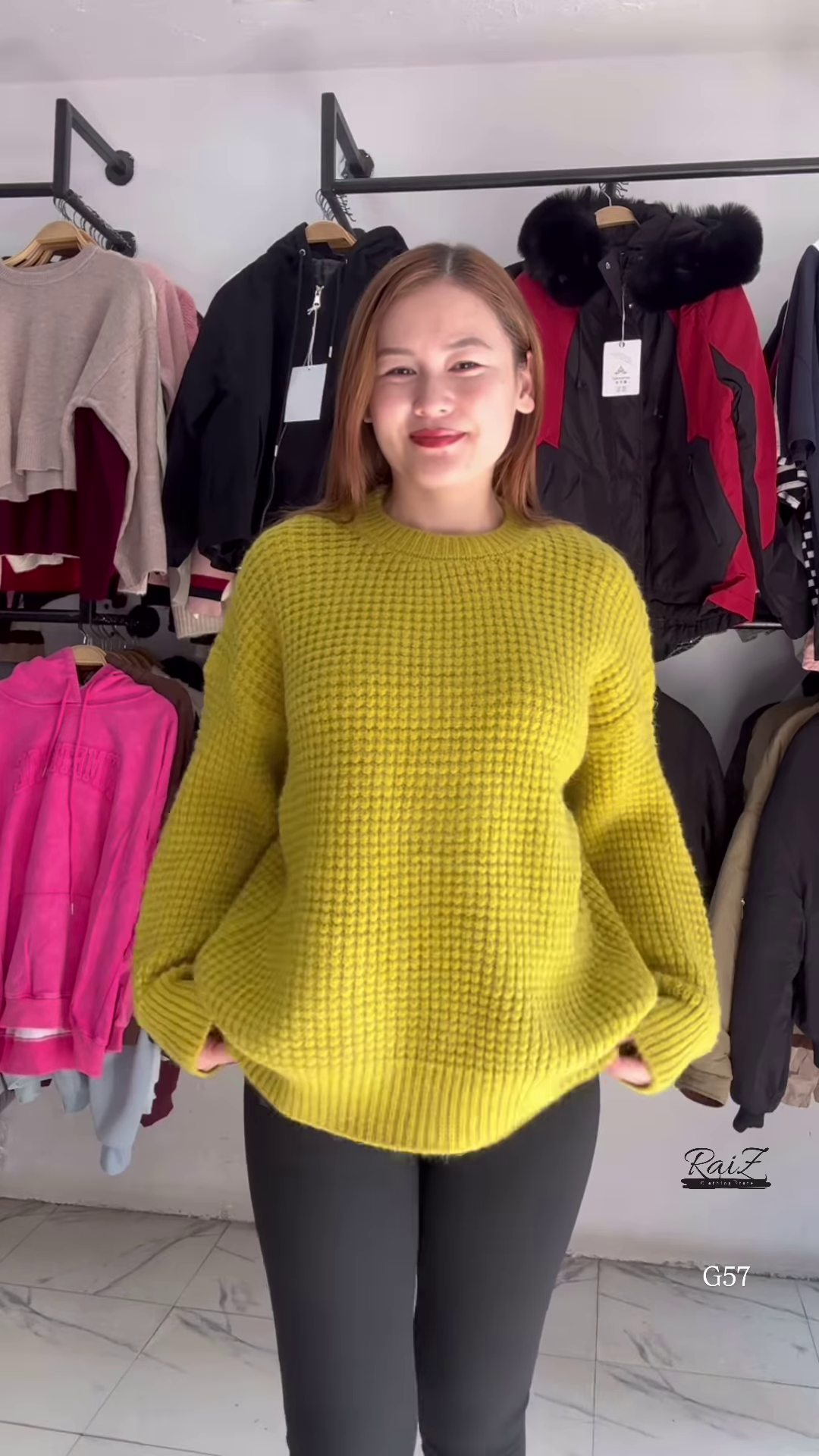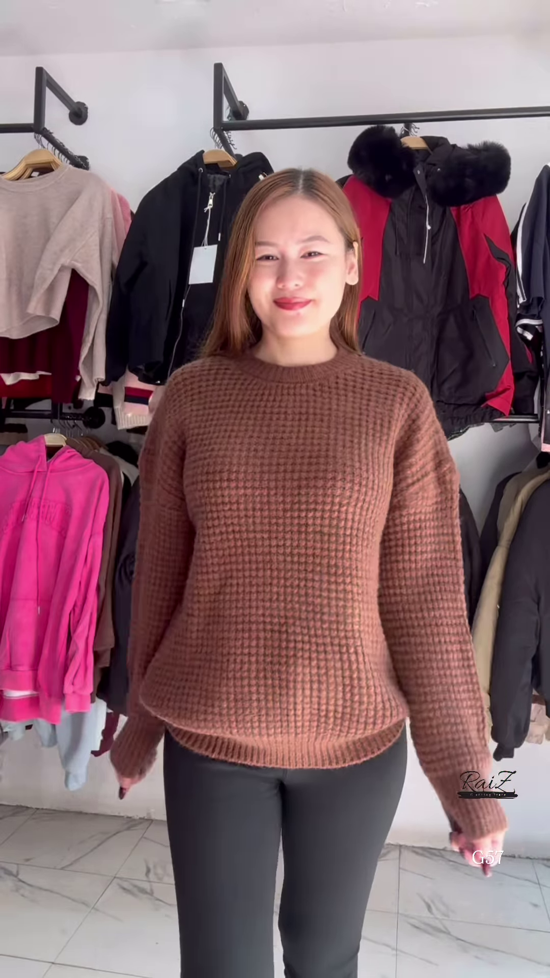 - 👕 Top: Textured knit sweater with full sleeves and relaxed fit